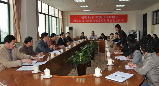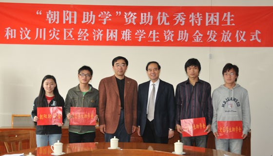 发放仪式由学生处处长邓世春主持。学生处副处长陈晓东总结汇报了我校一年来对四川地震灾区学生的自主情况和本次“朝阳助学”优秀特困生的评选工作,并宣读了受助学生名单。武广华书记为受助学生发放了助学金。朝阳助学金获得者屈娟同学代表受助学生做了发言。