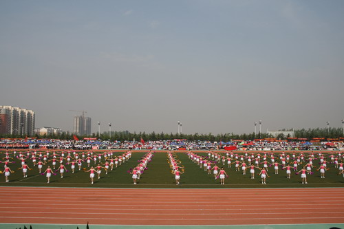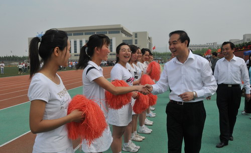 白波指出,今年是新中国成立60周年,也是学校新一届党委领导班子上任以来举办的第一届田径运动会。近一年来,学校全面贯彻落实国家的教育方针政策,以科学发展观为统领,坚持以育人为本,以教学为中心,积极推进民主管理、依法治校,大力实施内部管理体制改革,不断提高教育教学质量,形成了良好的校风、学风和教风,教育教学、管理质量、校园面貌和社会声誉都得到了显著提升。他说,本届运动会的举行,既是我校围绕庆祝新中国成立60周年,深入开展群众性主题教育实践活动,积极推进社会主义核心价值体系建设的重要体现,也是对我校体育工作、师生身体素质和精神风貌的一次检阅,更是各院、系、部群体意识、竞争意识、团队精神的综合体现。因此,广大师生应以本届运动会为契机,大力弘扬“万众一心,众志成城”的抗震救灾精神和“更高、更快、更强”的奥林匹克精神,不断激发师生员工的爱国主义和集体主义意识、振奋民族精神、凝聚师生力量,全面推动我校各项事业取得新成就,努力开创我校各项事业发展的新局面。本届运动会要以良好的精神面貌,优异的比赛成绩,积极向即将于10月份在济南召开的第十一届全国运动会献礼!