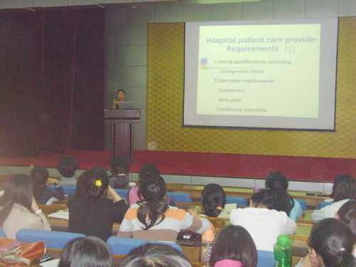 当天下午在学术报告厅张红为护理专业学生作了题为 “在美国的护理工作经历经验介绍和护士资格认证及评估”的讲座,并对同学们提出的问题作了的解答。最后,武书记做了重要讲话,他希望同学们能够志存高远,学好知识,走出国门深造,从而能更好为国家和社会做贡献。