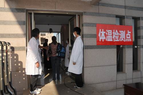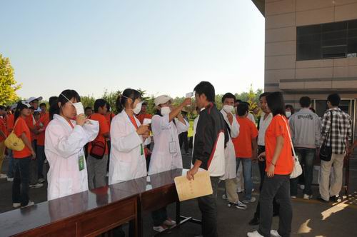 入口检疫责任重大。防控甲型H1N1流感工作责任重大,同学们始终铭刻于心。经过集中培训,监测点志愿者被分成二组,第一组负责使用手持非接触额温计进行初步检测,发现体温不正常者,则进入安检房间,使用红外体温筛检仪进行第二步检查,如有发烧症状者,则直接交与医务人员进行第三步水银体温计检测确认,疑似病例者则由专人专车送往隔离区进行隔离观察。
