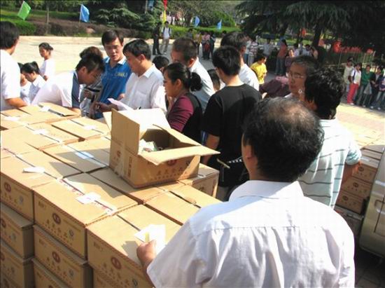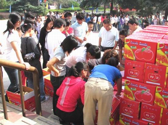 10月2日上午,秋高气爽,大学生活动中心前人头攒动,有的学生拎着月饼,有的学生抱着苹果,还有的在呼唤同学过来帮忙,在去二楼的楼梯上堆着小山似的装满月饼和苹果的箱子。