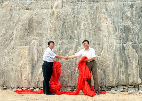 随后,白波与杨彩云共同揭开披挂在泰山石上的红彩,现场顿时掌声雷动,鞭炮齐鸣。