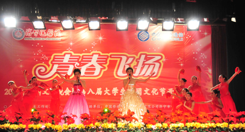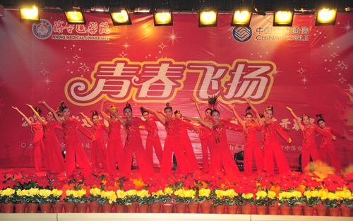 十月的北湖校区,金风送爽,天高云淡,秋色宜人。25日、26日晚,由学生工作处、团委、学生会主办,社团联合会、大学生艺术团协办的“青春飞扬”——2010年迎新文艺晚会暨第八届大学生社团文化节开幕式在大学生活动中心隆重举行。党委副书记、院长白波,党委副书记刘学景,副院长温杭东,有关职能部门负责人、各二级学院党总支负责人,部分学生管理队伍老师与2700余名2010级新同学一起观看了演出。