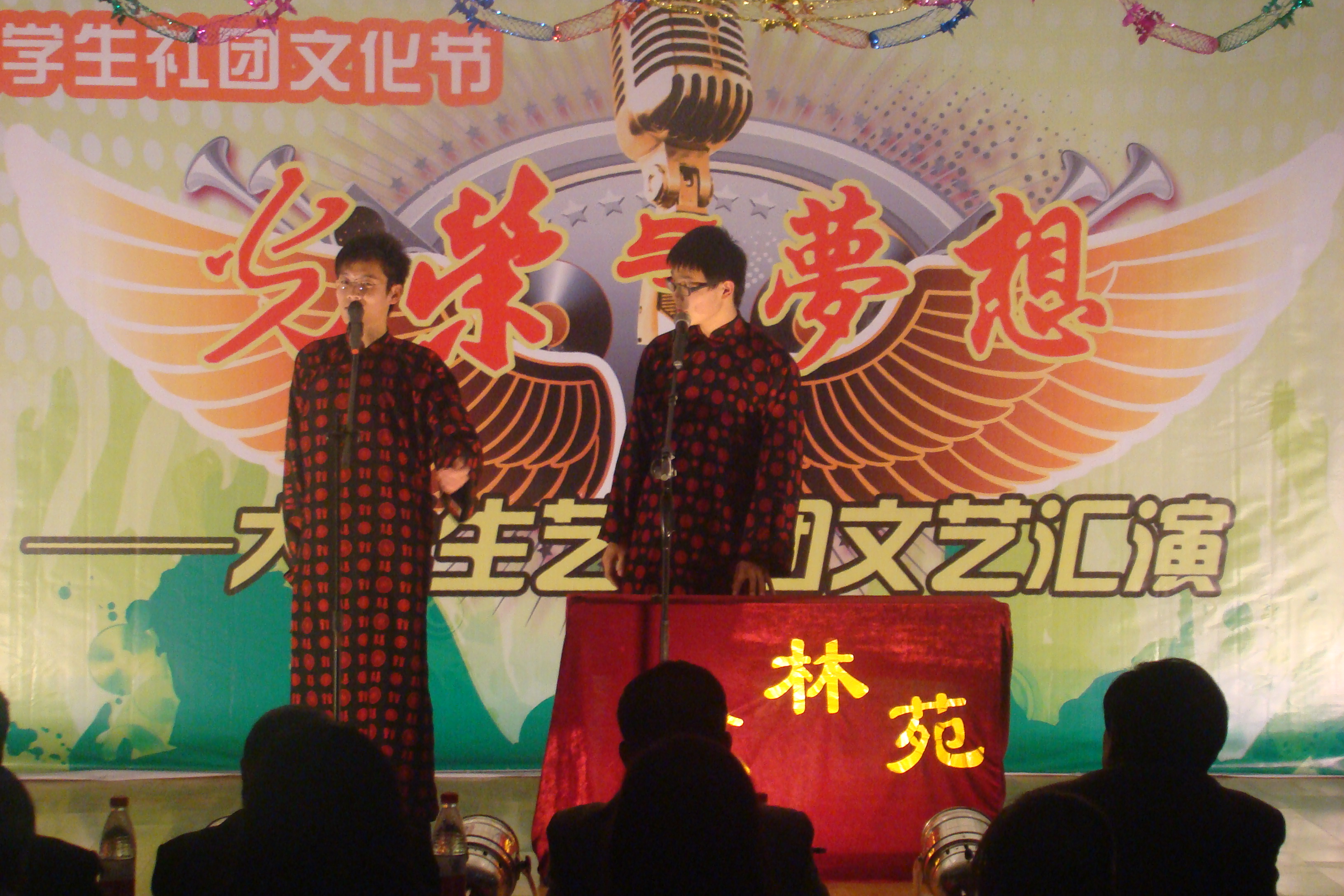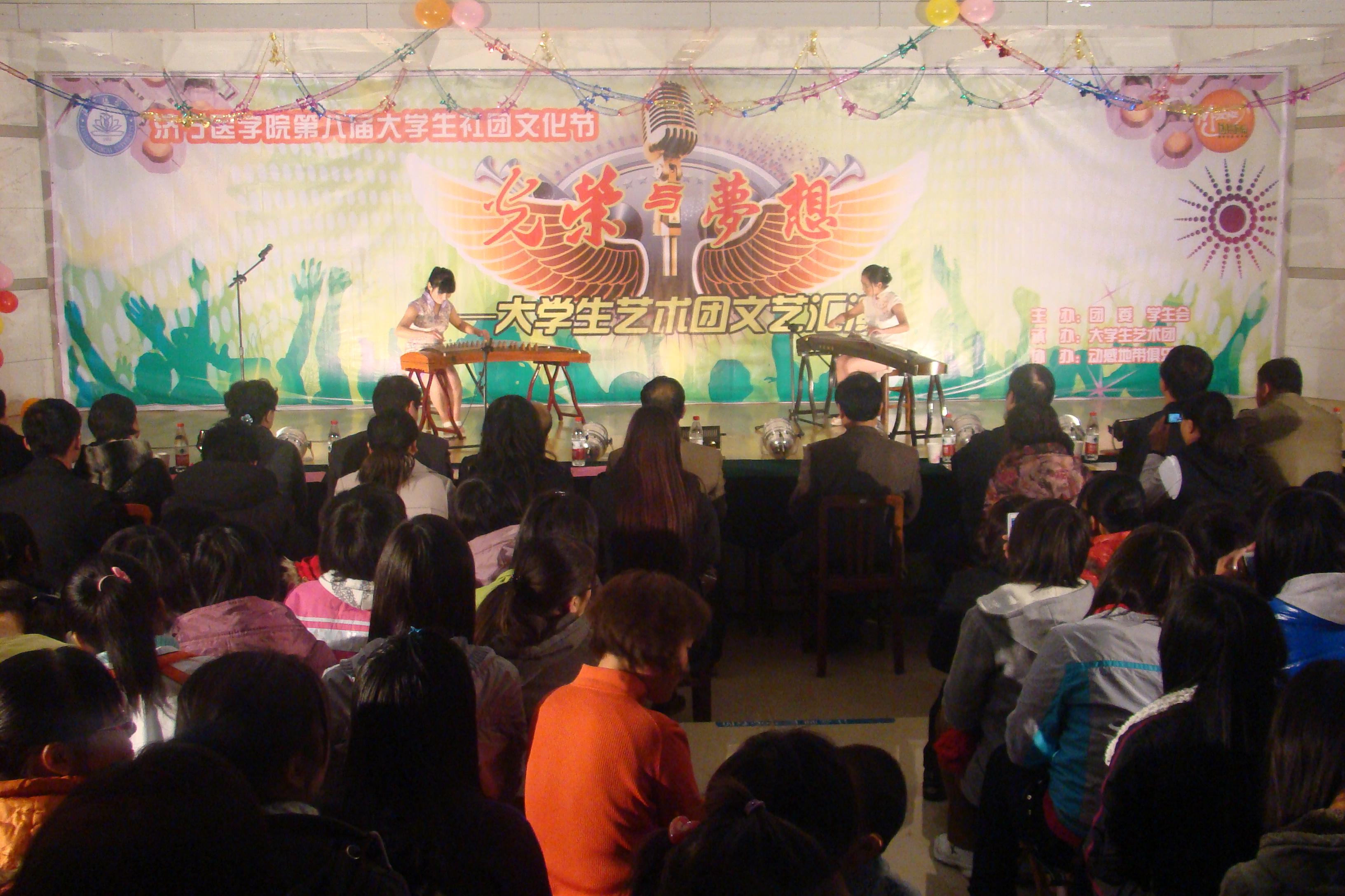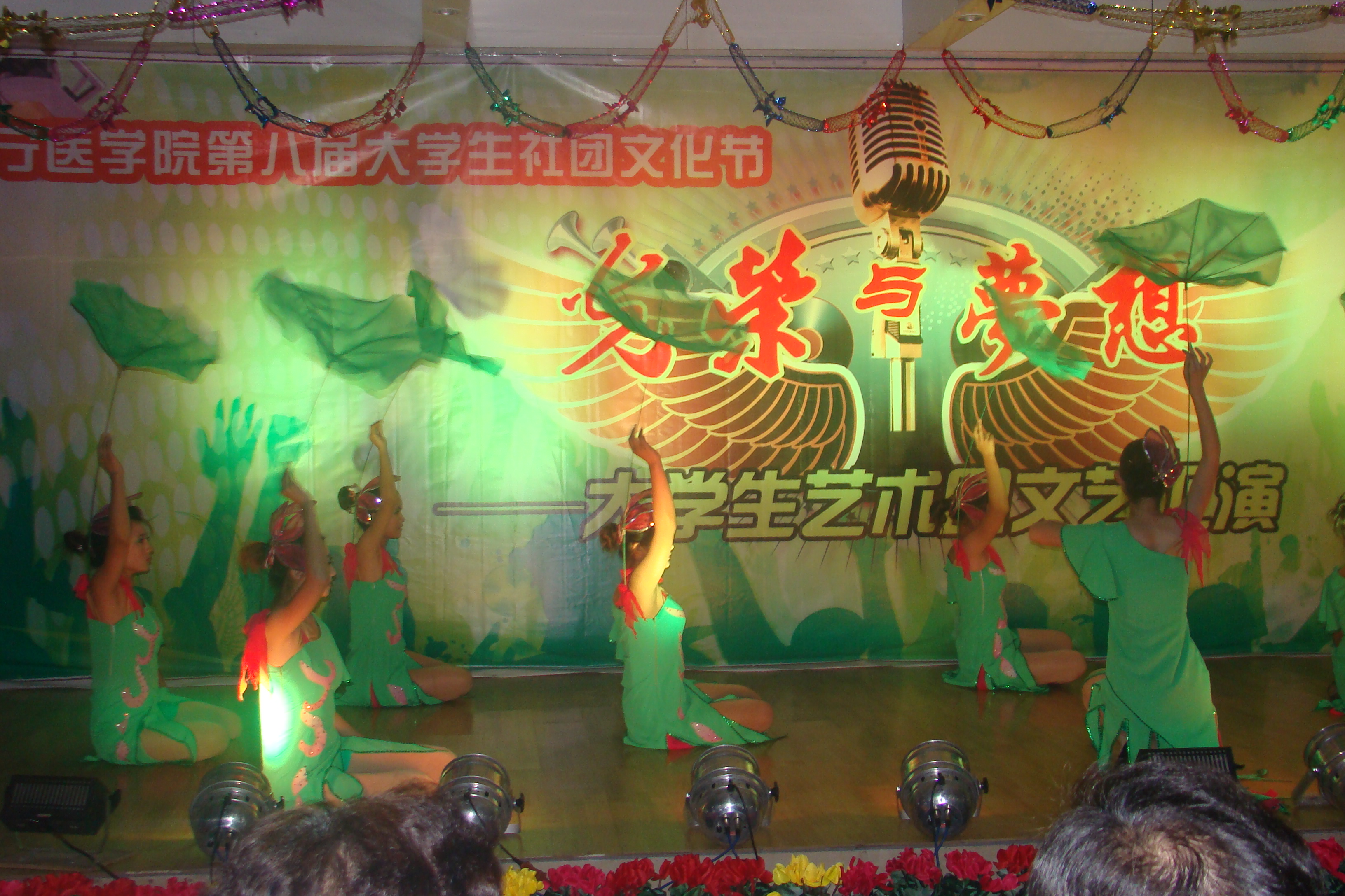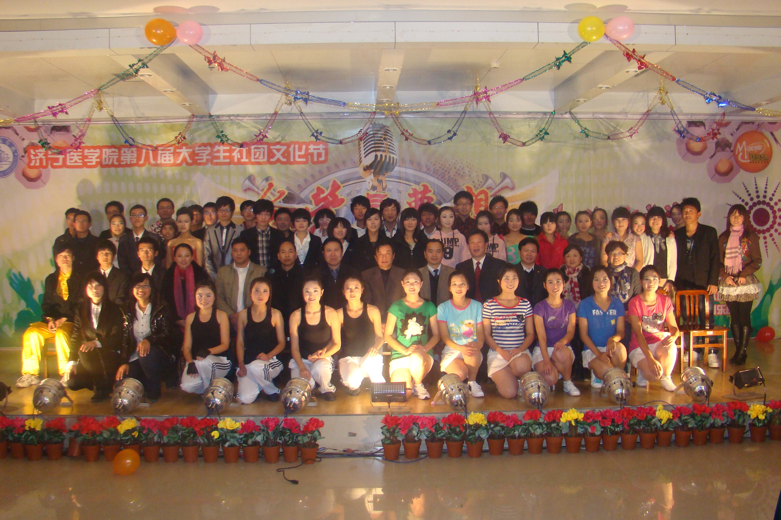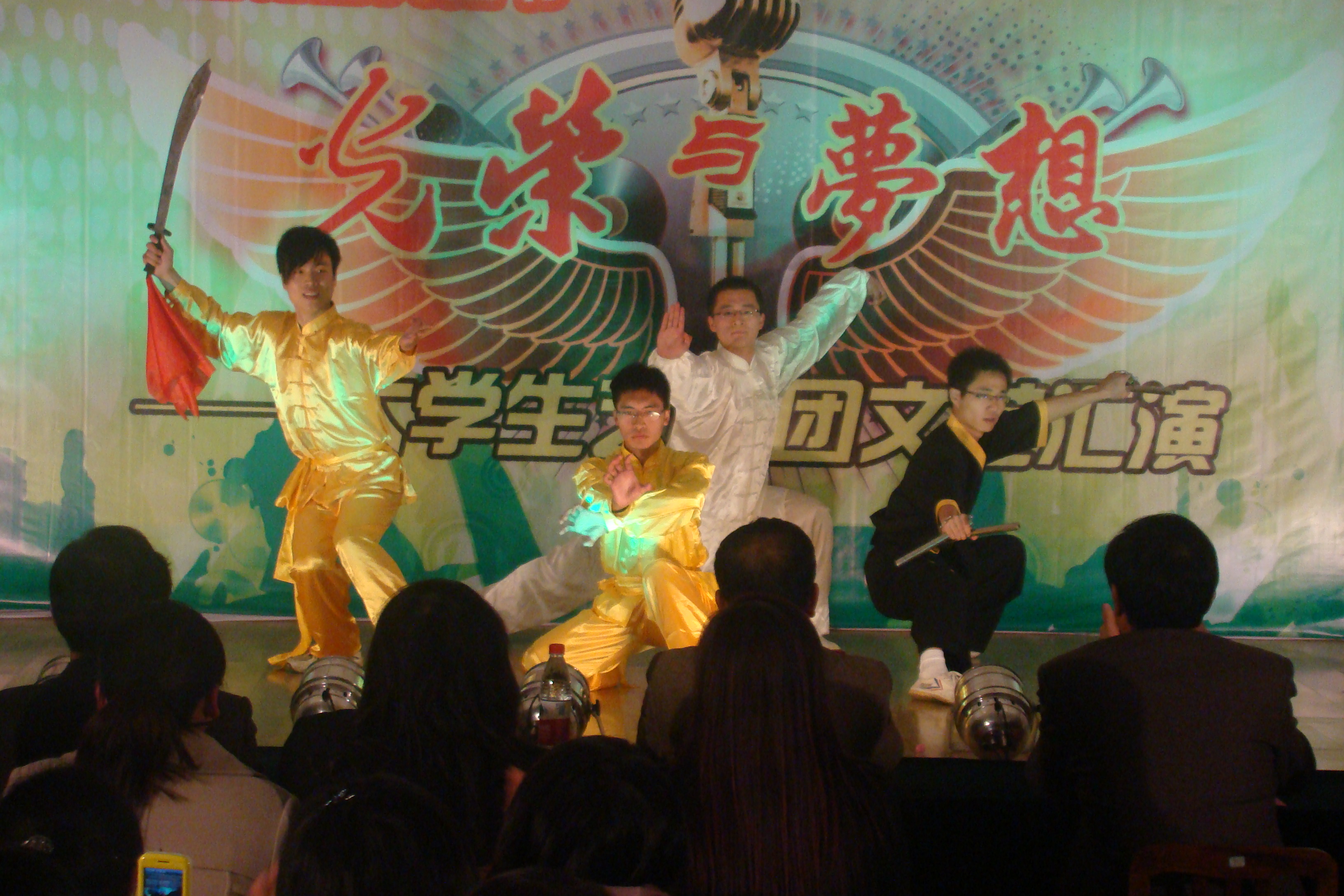 整台晚会节目形式多样,既有歌曲、舞蹈、健美操,又有相声、双簧、话剧和小品,还有朗诵、器乐演奏和武术表演等。开场舞《清风荷影》清新洒脱,绿意盎然,提升了整台晚会的艺术品位;太极拳、南拳、刀术、双截棍等中国功夫表演的踢、打、摔、拿、击、刺等动作连贯、一气呵成,引得全体观众掌声不断,喝彩连连;由 我校大学生艺术团自成立以来,一直得到学校各级领导的高度重视和关心、关爱,尤其是2008年以来,在校党委的领导下,在校团委的指导下,大学生艺术团蓬勃发展,艺术水平不断提高。本次文艺汇演是艺术团向师生展示建设成果的阶段汇报。同时,汇演特设观众投票一项,所有表演节目由现场师生评选出一二三等奖,并作为汇演表彰的主要依据。根据投票结果,双簧《我们也来凑热闹》、武术表演《中国功夫》、相声《口吐莲花》喜获一等奖;其他节目分获二、三等奖。本次文艺汇演的成功举办,也是我校大学生艺术团追求新的“梦想”、实现跨越的新起点。 (团委 陈海华 文/摄) 双簧《我们也来凑热闹》 武术表演《中国功夫》 相声《口吐莲花》 古筝合奏《渔舟唱晚》 舞蹈《清风荷影》 学校领导与全体演员合影留念
