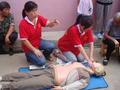 志愿者现场为老百姓演示急救操作