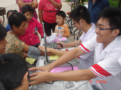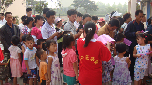志愿者向老百姓发放医疗保健知识宣传单