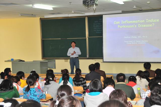 2011年4月19日 下午3:40在教学楼103教室,基础医学与法医学院青年教师程葆华博士作了题目为《 炎症与帕金森病》的学术讲座。由科研处和基础医学与法医学院共同组织,科研处副处长刘传新博士主持,基础医学与法医学院副院长郭子林讲话,二百多名教师和学生聆听了讲座。