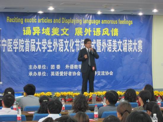 “提高外语技能、展示青春风采”。5月20日下午,由团委、外语教学部联合主办的首届大学生外语文化节闭幕式暨“诵异域美文、展外语风情”外语美文诵读大赛在教学楼中报告厅举行。党委副书记刘学景出席闭幕式并发表了热情洋溢的讲话,党委宣传部、学生工作处、教务处等职能部门负责人、各院系分管教学工作负责人、各团总支负责人与200余名同学代表一起参加了闭幕式。