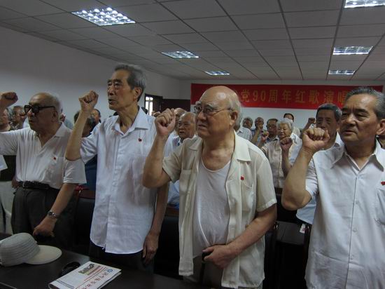 老党员们在面对党旗,重温入党誓词时,回想起当年的理想激情和奋斗追求,回想起入党宣誓时的庄严承诺和铿锵决心,回想起几十年来为中国革命、建设和改革艰苦奋斗、呕心沥血、无私奉献的奋斗历程,无不感到心潮澎湃、骄傲和自豪,他们决心在新的历史时期永远保持共产党员的先进性,老有所为、老有所乐,用一生捍卫在党旗下的承诺!