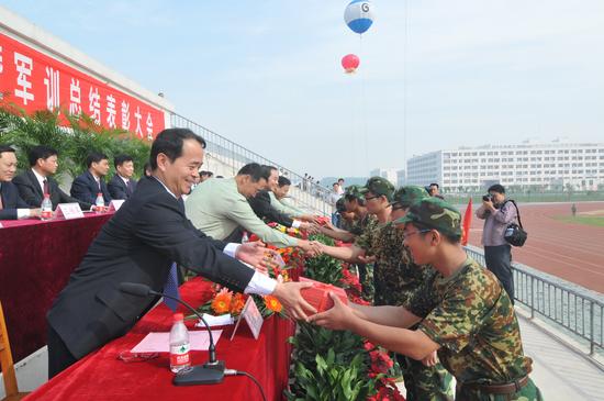 学生工作处处长邓世春宣读了2011级学生军训优秀连队和优秀标兵获奖名单。学校领导为获奖集体和个人颁发了证书。