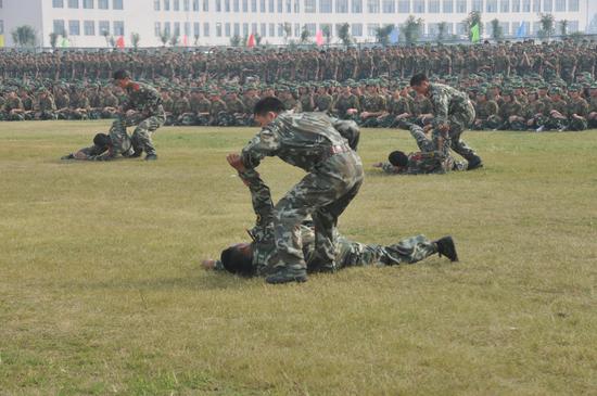 大会在庄严的国歌声中开始。首先进行的是分列式汇报表演,和着有力的节拍,参加军训的2011级新生分成26个方队,迈着整齐的步伐,昂首挺胸,意气风发,雄健地从主席台前正步走过,接受领导和部队首长的检阅,展示了济宁医学院学子的飒爽英姿。汇演后,武警济宁支队的教官表演了精彩的擒敌术。