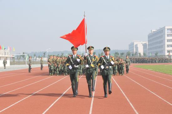 大会举行了庄严的升国旗仪式,2011级新生进行了军训分列式汇报表演。
