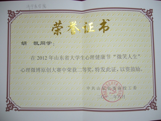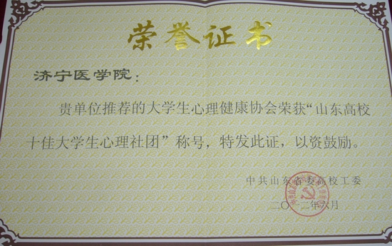 会议还对2012年山东高校大学生心理健康节优秀组织单位、获奖项目及获奖作品进行了表彰。我校被评为“山东省2012年大学生心理健康节优秀组织单位”,大学生心理健康协会荣获“2012年山东高校十佳大学生心理社团”,胡凯同学的微博荣获山东高校“微笑人生”大学生心理微博原创大赛二等奖。