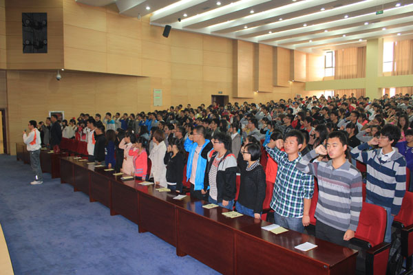 10月20日上午,我校60周年校庆志愿者誓师大会在学术报告厅举行,副院长高哲学、赵敏出席大会,校庆筹委会有关工作人员,有关职能部门负责同志,济宁校区各院系部负责同志和500余名校庆志愿者一起参加大会。赵敏主持大会。