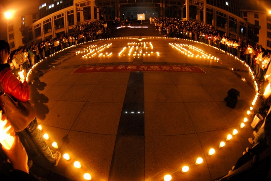 本次活动由学生工作处主办,近千名学生参加。同学们在广场上用蜡烛摆成“心”状,正中摆成“4.20”几个大字,表达了同学们心系雅安、情牵雅安的心情。全场肃立,伴着沉痛的诗文朗诵后,首先由四川籍同学代表发言,然后同学们为在此次大地震中遇难的同胞默哀3分钟。活动结束时,学生们齐声喊出“雅安加油,中国加油”的口号,寄托了我校学子的无限哀思和对灾区同胞的殷殷祝福。