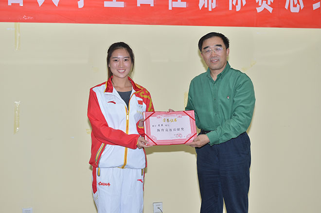 白波为2013年山东省大学生田径锦标赛女子乙组200米冠军李燕颁奖