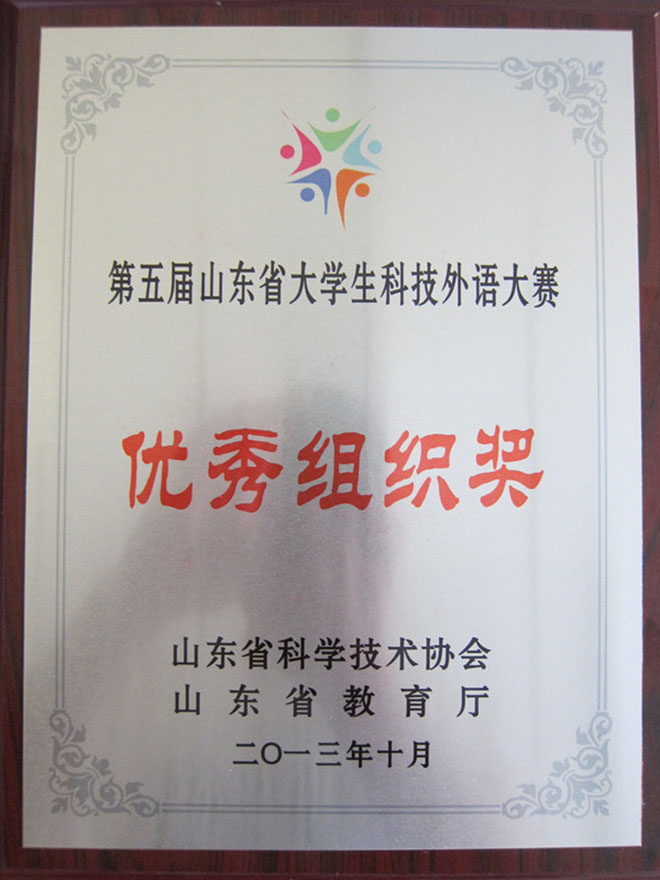 10月13日至15日,由山东省科协、山东省教育厅主办的“第五届山东省大学生科技外语大赛”在山东交通学院举行。我校选派选手外语系王媛子荣获专业组一等奖,精神卫生学院卢玉峰荣获非专业组二等奖,外语系张洁老师荣获“优秀指导教师”荣誉称号,我校荣获“优秀组织奖”。
