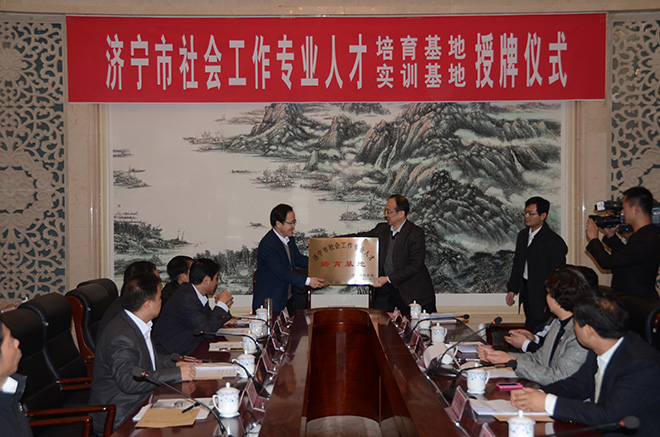 济宁市委组织部副部长马文胜首先就加强社会工作专业人才队伍建设讲了话,对建设济宁市社会人才培育基地的工作提出了明确要求。济宁市委组织部、市民政局依托相关单位联合设立社会工作专业人才培育基地,是利用高校的资源优势和教育管理经验,探索建立社会工作专业人才培养的长效机制,采取全方位、多层次办学的形式,分专业、分类别地开展专门的社会工作理论与实务培训,如社会福利、扶贫济困、慈善事业、社区建设、婚姻家庭、精神卫生、残障康复、教育辅导、就业援助、职工帮扶、犯罪预防、禁毒戒毒、矫治帮教、人口计生、应急处置、群众文化等领域的社会工作岗位新入职工的岗前培训及技能专业人员的继续教育培训。我校继续教育学院是济宁市三家社会工作专业人才培育基地之一。