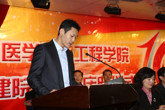 医学信息工程学院院长孔繁之代表医学信息工程学院对学校领导、社会各界的关心祝愿表示感谢,从教学质量建设、专业建设、硬件建设、师资队伍、科研创新、学生文体活动等方面回顾总结了医学信息工程学院十年历程和取得的成绩,从学科建设、校企合作、学生培养三个方面对学院发展规划进行了展望。