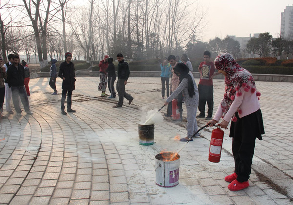为了提高我校留学生的消防安全意识和消防应对能力,1月16日下午,外语系在日照校区本草园广场举办了留学生消防安全演练活动,2013级全体留学生参加了演练。