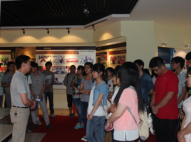 解说员时而激情澎湃,时而娓娓道来,在她们的引领下,济医60余年的发展变迁犹如一幅幅画卷,在同学们面前徐徐展开。在校训浮雕墙前,同学们安静驻足,静静的感受着济医建校60余年的厚重积淀,深刻体味着“明德、仁爱、博学、至善”的深刻内涵;在一幅幅老照片前,同学们为母校办学初期的艰辛历程而感慨万千,为一代代济医人的付出与努力而声声赞叹;面对济医60余年来所取得的辉煌成就,临床本科一班的一位同学脱口而出,“没想到咱们济医还这么霸气”,引起了大家的一致认可和掌声。一位老师说,“母校就像我们的母亲一样,或许她还存在着这样那样的不足,但我们绝不允许别人说她半个‘不’字,因为我们一如既往地深爱着她;一代代济医人创造了母校今天的辉煌,我们为是其中的一份子而感到无比的光荣和自豪;希望大家勤奋学习,掌握本领,将来以更加优异的成绩和更加杰出的成就感恩母校、建设母校”。