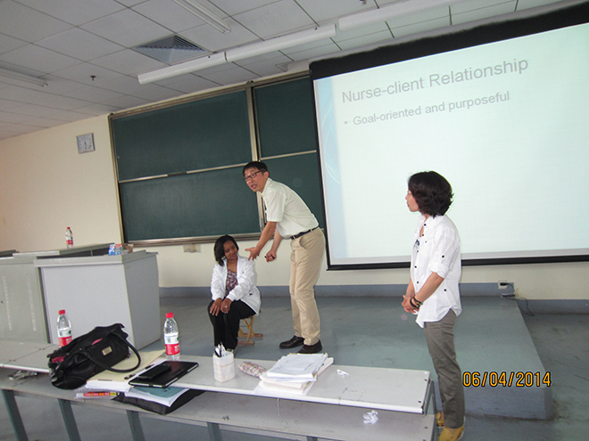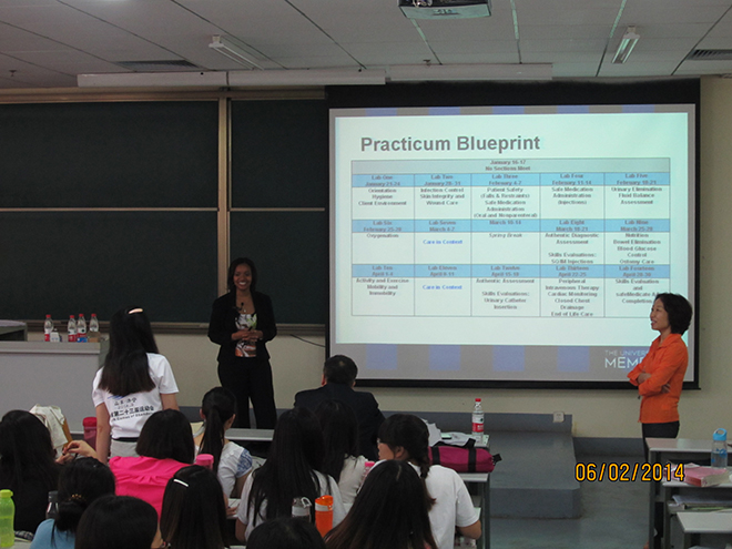 美国孟菲斯大学护理学院教授在校期间,为护理学院2011级中美合作办学护理班、2010级、2011级涉外护理专业学生授课。主要课程包括,护理学基础、儿科护理学、护理沟通与交流等,共50学时。Dr. Shirleatha Lee 教授一行以严谨的治学态度和执着的敬业精神赢得了护理学院师生的好评,他们认真准备每次课教学内容,精心策划提高学生兴趣的授课方法,做到内容新颖、方法独特、语言幽默、声情并茂,每堂课都精彩纷呈,不时赢得全场的阵阵掌声。