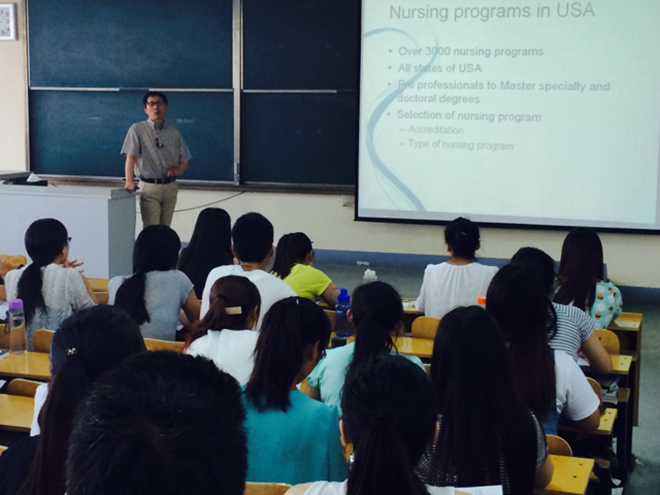 授课之余,美国教授还与护理学院教师进行了广泛的交流,深入探讨护理学专业课程设置,探索更深层次的合作办学思路和模式。Dr. Hoi Sing Chung为学生做了《关于美国护理教育》的精彩报告并与学生进行了互动交流。