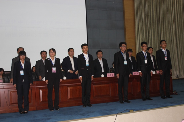 会上,王传军、陈吉义为新媒体中心揭牌,王传军、陈吉义、王乐军分别为新媒体中心、“校园之声”广播台、大学生记者总站授牌;主席台前排就座的领导老师为三个组织干事代表授证。学生代表带领全体干事进行了宣誓。