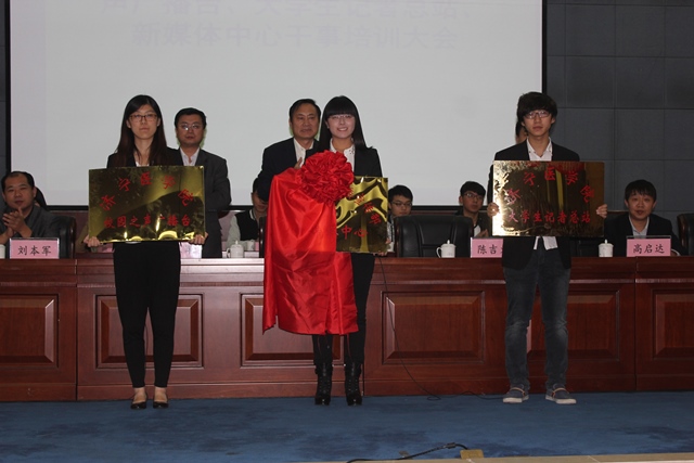 10月15日晚,党委宣传部新媒体中心揭牌仪式暨新媒体中心、“校园之声”广播台、大学生记者总站干事培训大会在图文信息楼五楼举行。党委宣传战部部长王传军、学生工作处处长陈吉义、党委宣传统战部副部长王乐军出席活动。
