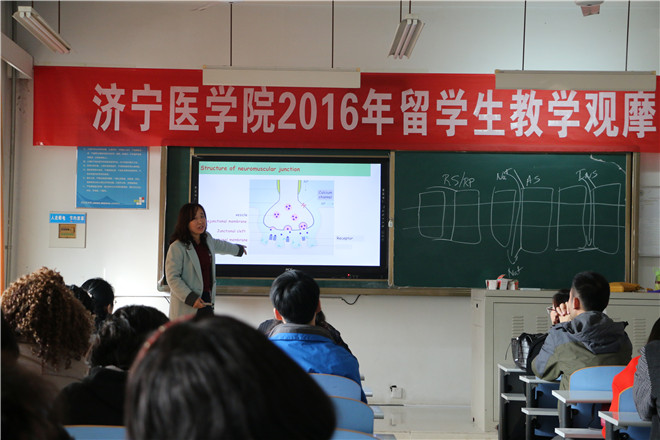 国际交流与合作部副主任朱荔芳主持了活动,药学院基础医学教研室的李丽和杜晶两位老师分别就《神经肌肉接头处兴奋的传递》、《发热》两个题目进行了示范授课。她们备课认真,英语口语表达流利、准确,讲授富有激情,板书与课件完美结合,内容全面、重点突出;注意加强课堂提问,引导学生们积极互动。在讲授知识的同时,两位老师还针对学习态度、学习方法、知识衔接等方面给予指导,受到学生们的好评。授课后,学生和老师们围绕本次观摩课及平时教学进行了热烈讨论,提出了意见建议,形成了共识。