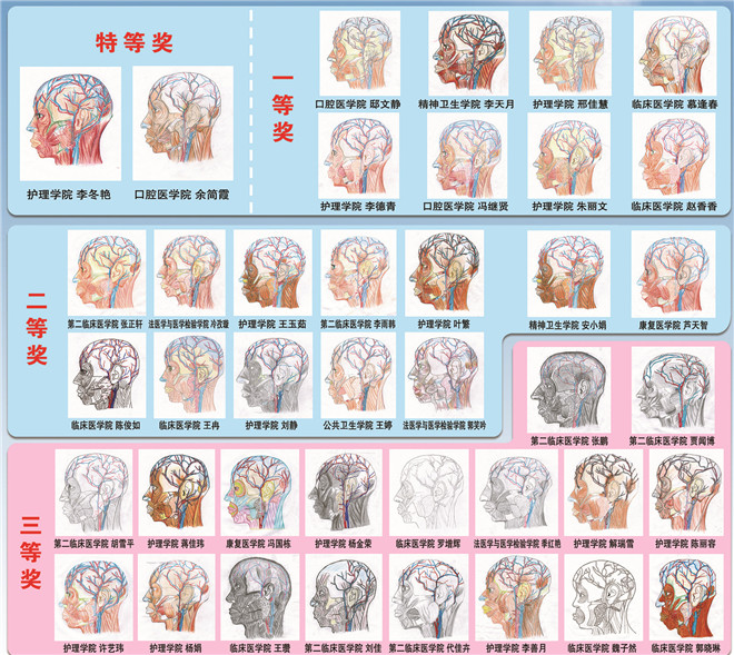 决赛阶段,参赛者在规定时间内完成命题作品的绘制,经专家组匿名评审,护理学院李冬艳、口腔医学院余简霞同学获特等奖,精神卫生学院李天月等8名同学获一等奖,护理学院叶繁等12名同学获二等奖,护理学院杨娟等18名同学获三等奖。