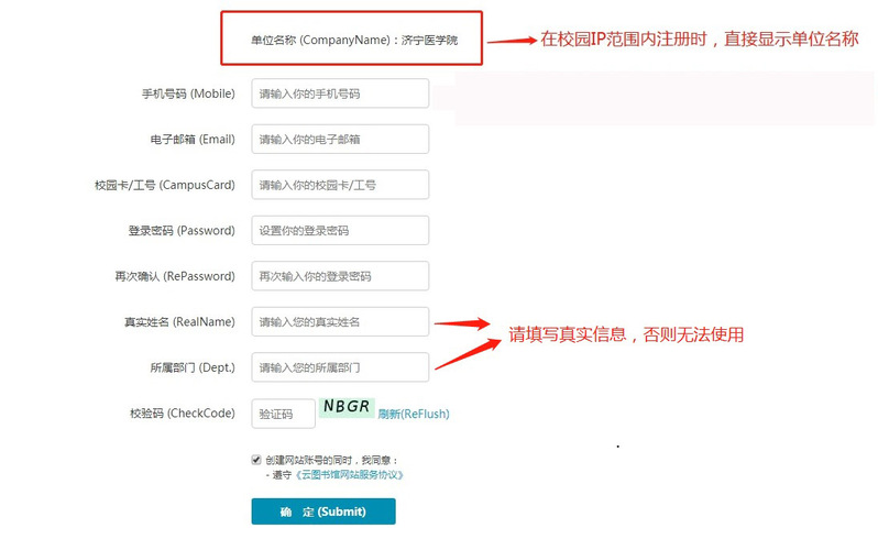 2.填写注册信息。注册时请填写真实姓名和部门,否则无法使用。校内注册时可直接显示我校单位名称,无需进行单位认证。如下图所示。