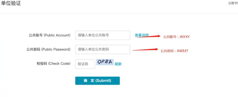 校外注册时需输入公共账号和密码进行单位验证。公共账号:JNYXY,公共密码:JN0537。