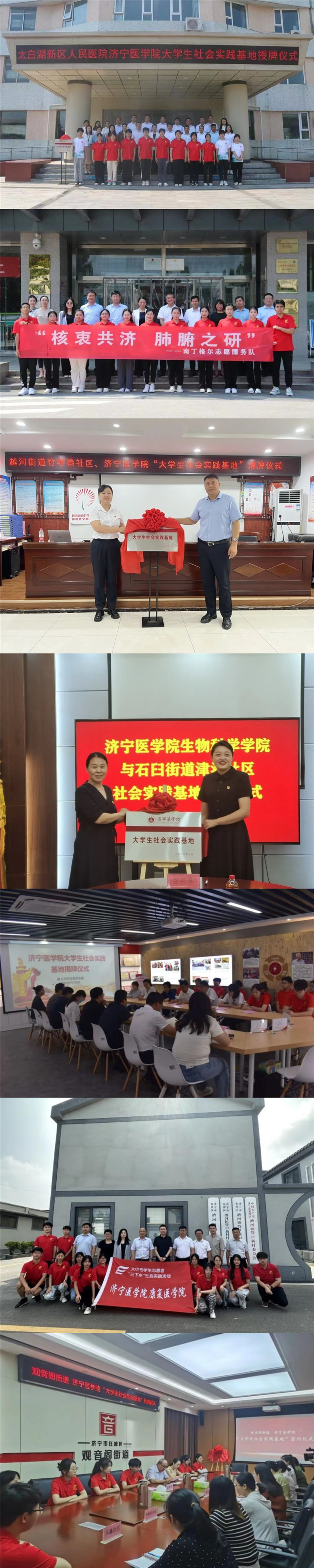 7月15日至19日,我校先后在日照市石臼街道津海社区、济宁太白湖新区人民医院、济宁梁山县中医院(济宁医学院附属医院梁山院区)等7个单位举行大学生社会实践基地挂牌仪式。学校党委委员、宣传部部长曲相艳出席部分基地活动并讲话。