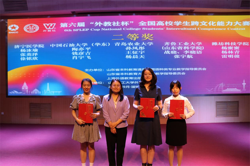 9月23日至24日,第六届“外教社杯”全国高校学生跨文化能力大赛山东赛区复赛和决赛在山东理工大学举行,由我校外国语学院教师褚宏蕊指导,2022级临床卓越班杨冰瑜、2022级口腔医学本科1班张英泽和2021级临床医学7班徐铭欣三名学生组成的代表队获大赛二等奖和最佳风采奖。