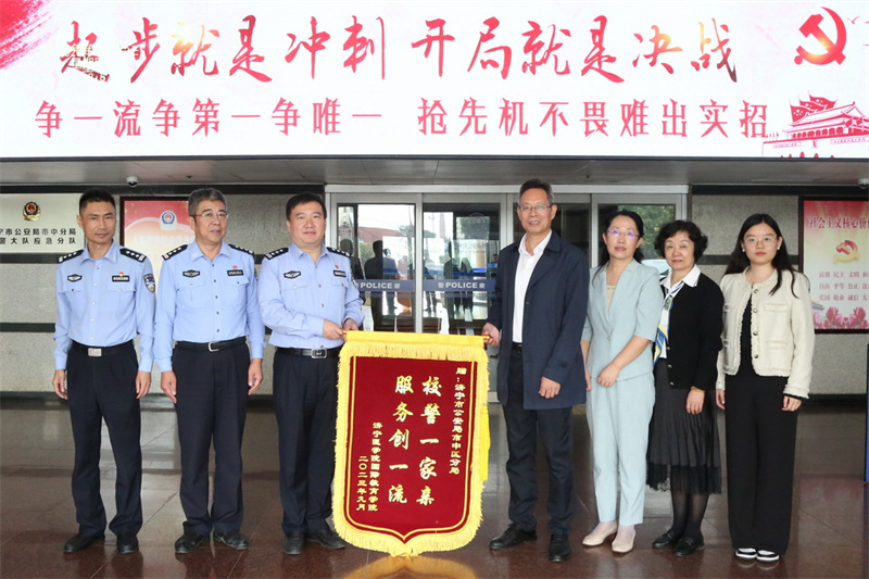 陈晓东介绍了我校留学生工作的基本情况,对公安部门多年来对我校留学生工作的支持和帮助表示感谢,并分别向济宁市公安局出入境管理支队、市中区公安分局和渔山派出所赠送了锦旗。