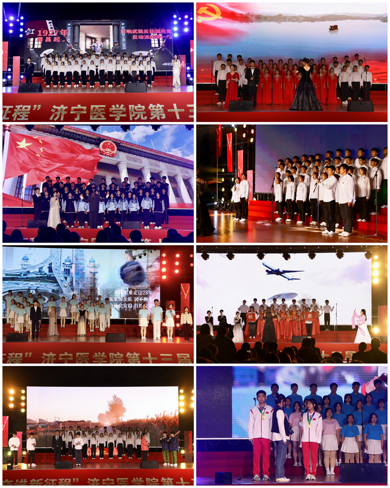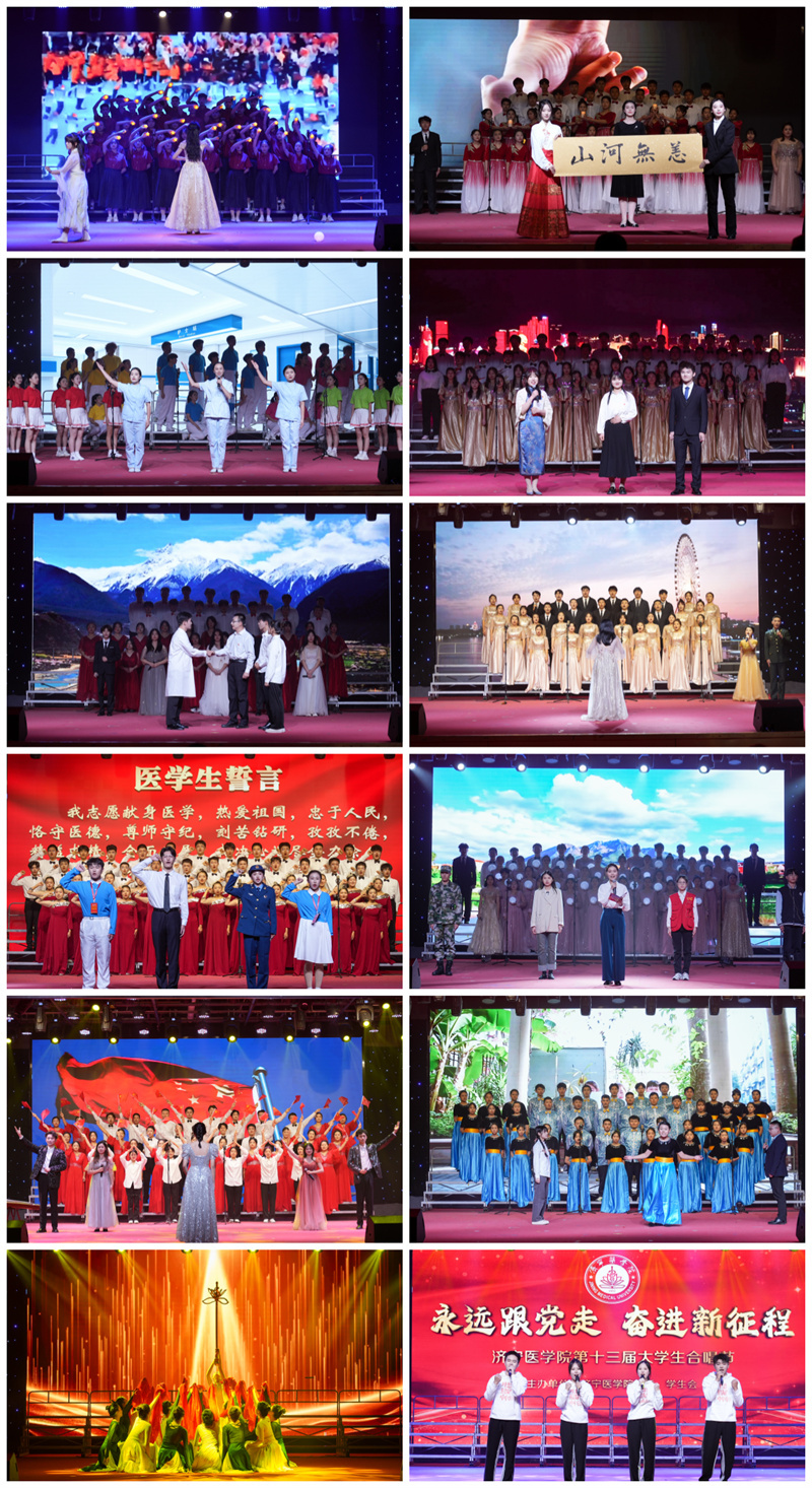 本届合唱节旨在营造“人人都参与,班级有歌声,学院有比赛”的氛围,以班级团支部为单位组建合唱队,辅导员、班主任与团支部成员共同参与表演。经二级学院初赛,18个团支部晋级校级决赛。合唱现场,《在灿烂阳光下》《如愿》《歌唱祖国》讲述了中国共产党领导全国人民筚路蓝缕、艰苦奋斗的光辉历程;《国家》《灯火里的中国》《早安阳光早安中国》描绘了当今盛世中国国泰民安、和谐安定的繁荣景象;《相亲相爱》《青春走在新征程》《强国一代有我在》展现了济医学子积极进取、勇担使命的青年担当;《再一次出发》《一起向未来》《明天会更好》表达了新时代新征程上不忘初心、勇毅前行的青年信心和青年理想。合唱队以情景剧、朗诵、舞蹈等艺术形式,带来精彩演绎,让艺术之美赋能思政课堂,为全校团员青年带来一堂别样的沉浸式艺术思政大课。