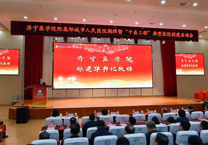 张建华在致辞中对邹城市人民医院成为我校非直属附属医院表示祝贺,并简要介绍了学校和济宁医学院附属医院的基本情况。他指出,此次揭牌标志着校院合作又迈出了重要一步,搭建起更加紧密的合作平台。他表示,学校将充分发挥人才队伍、学科平台、技术资源、科学研究等方面的优势,积极帮助医院提升医教研能力。他希望医院全面融入济医,坚持强院与兴校同谋划同部署、医教研一体化发展,充分发挥附属医院临床教学主体职能,夯实医学人才培养主阵地,不断提高医院综合实力,联手打造医校合作新样板。