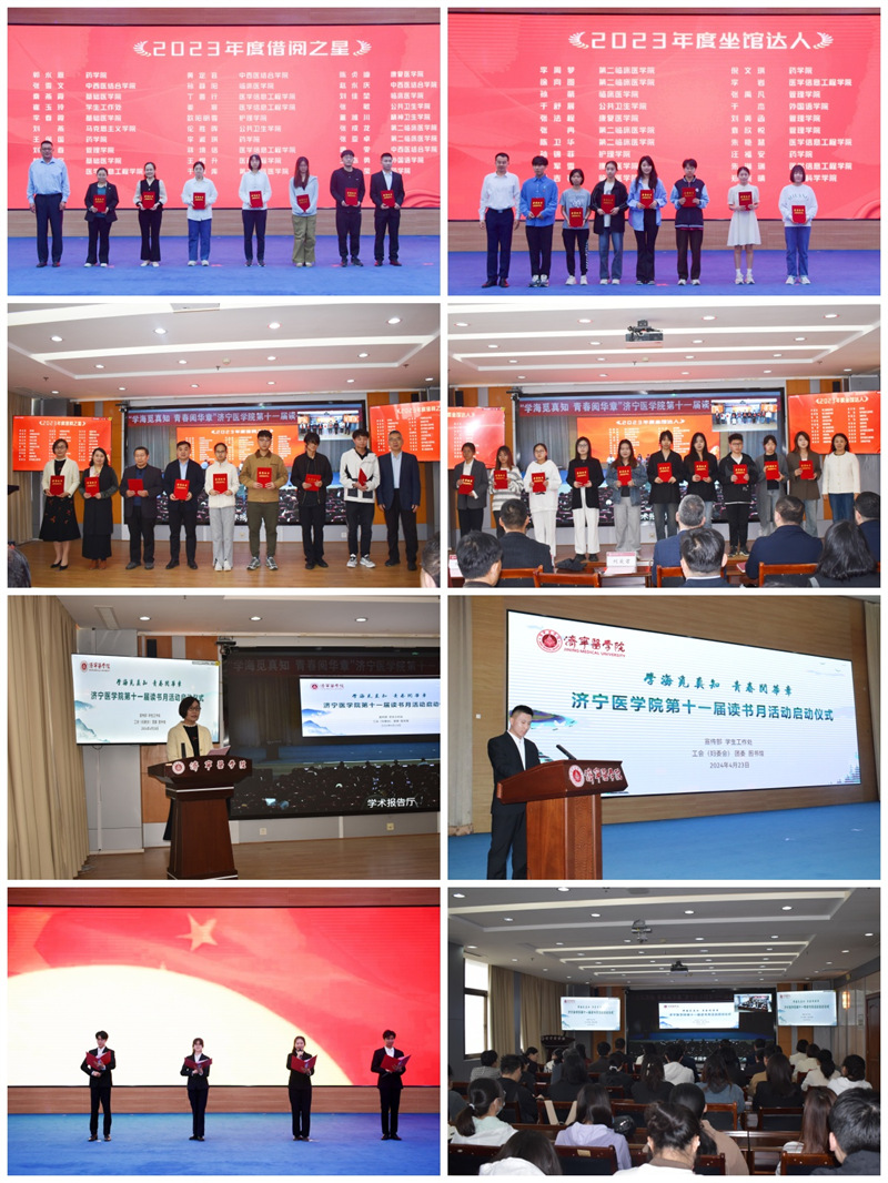 会上表彰了2023年度“借阅之星”和“坐馆达人”,获奖教师代表学生工作处崔玉玲、学生代表2022级临床医学专业孙薛阳分别发言,分享阅读感悟;陈柯心等四位同学激情朗诵《复兴颂》,生动诠释了家国情怀和时代精神。