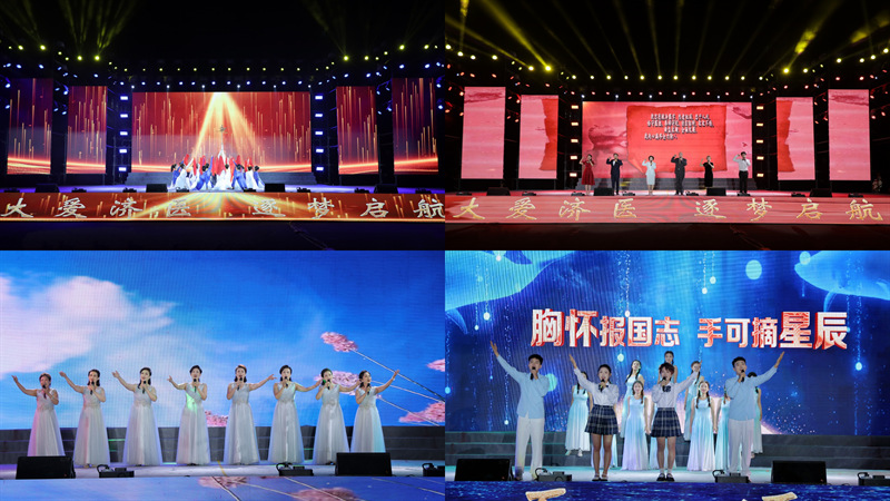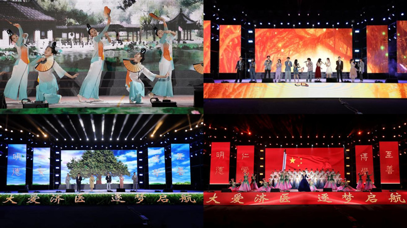 晚会在未来处方乐队的精彩表演中拉开帷幕。晚会共分为“欣逢盛世·守初心”“薪火相传·淬韶华”“笃行致远·扬新帆”三个篇章。原创舞蹈《源·生命》、小合唱《今天是你的生日,我的中国》《我们的生活充满阳光》、原创讲述《我的济医初心》、歌舞《有我》表达了共祝祖国生日的美好心愿,讲述了一代代济医人不忘健康所系,不负性命相托,用实际行动坚守初心向医学致敬的奋斗故事。艺术党课《接力》、啦啦操表演《炫舞青春》、原创歌舞《济医青年说》展现出当代济医人传承光荣与梦想,在青春的赛道上拼搏奋斗的精神风貌。舞蹈《春颂》、歌曲串烧《稻香》《小城夏天》《第一天》《最美的太阳》、朗诵《长大的模样》表达了新同学对大学生活的美好期待和笃行致远的信念与追求。