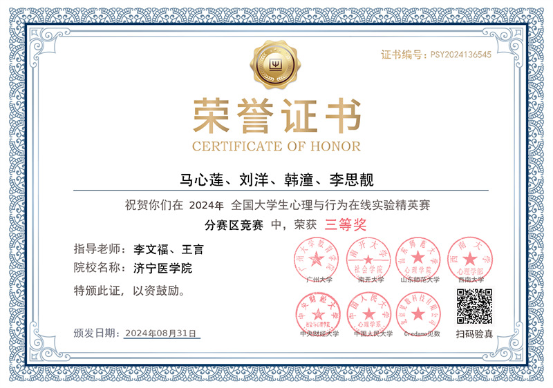 近日,第二届全国大学生心理与行为在线实验精英赛分赛区竞赛圆满落幕。由我校精神卫生学院教师季善玲、郁昊指导的王浩、吕杨、泥睿三名学生的参赛项目获得东部赛区二等奖,由教师李文福、王言指导的马心莲、刘洋、韩潼、李思靓四名学生的参赛项目获东部赛区三等奖。
