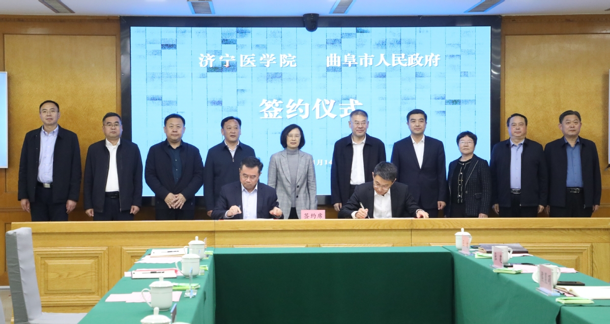 甘立军与侯晨硕代表双方签署了《济宁医学院曲阜市人民政府战略合作协议书》,与曲阜市卫健局党组书记、局长张建共同为“济宁医学院附属中医院”揭牌。