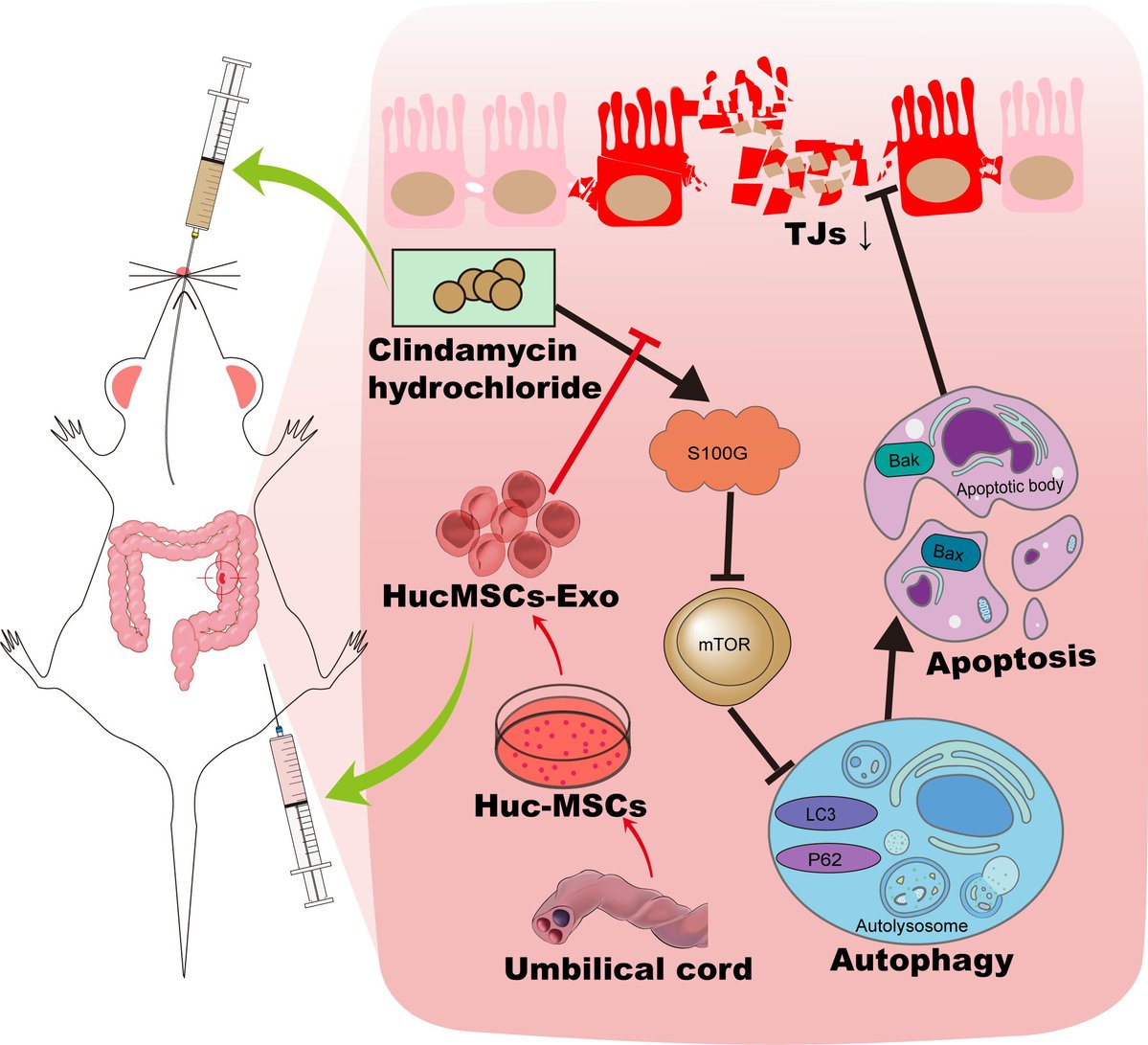 本研究通过构建小鼠肠道屏障损伤模型,发现人脐带间充质干细胞来源外泌体(HucMSCs-Exo)可显著改善抗生素引起的体重下降、结肠缩短、黏膜结构破坏及紧密连接蛋白表达降低等损伤,且高剂量效果更优。机制上,转录组分析显示S100G是本研究通过构建抗生素诱导的小鼠肠道屏障损伤模型,发现人脐带间充质干细胞来源外泌体能够有效改善肠道组织病理损伤、降低通透性并恢复紧密连接蛋白表达,且保护作用具有剂量依赖性。机制研究表明,S100G是外泌体治疗过程中的关键调控基因。进一步实验证实,抑制S100G表达可通过激活mTOR磷酸化,进而抑制过度自噬与细胞凋亡,从而恢复上皮屏障功能。该研究揭示了S100G/mTOR通路作为外泌体调控自噬缓解肠道损伤的核心机制,为临床治疗提供了新靶点。