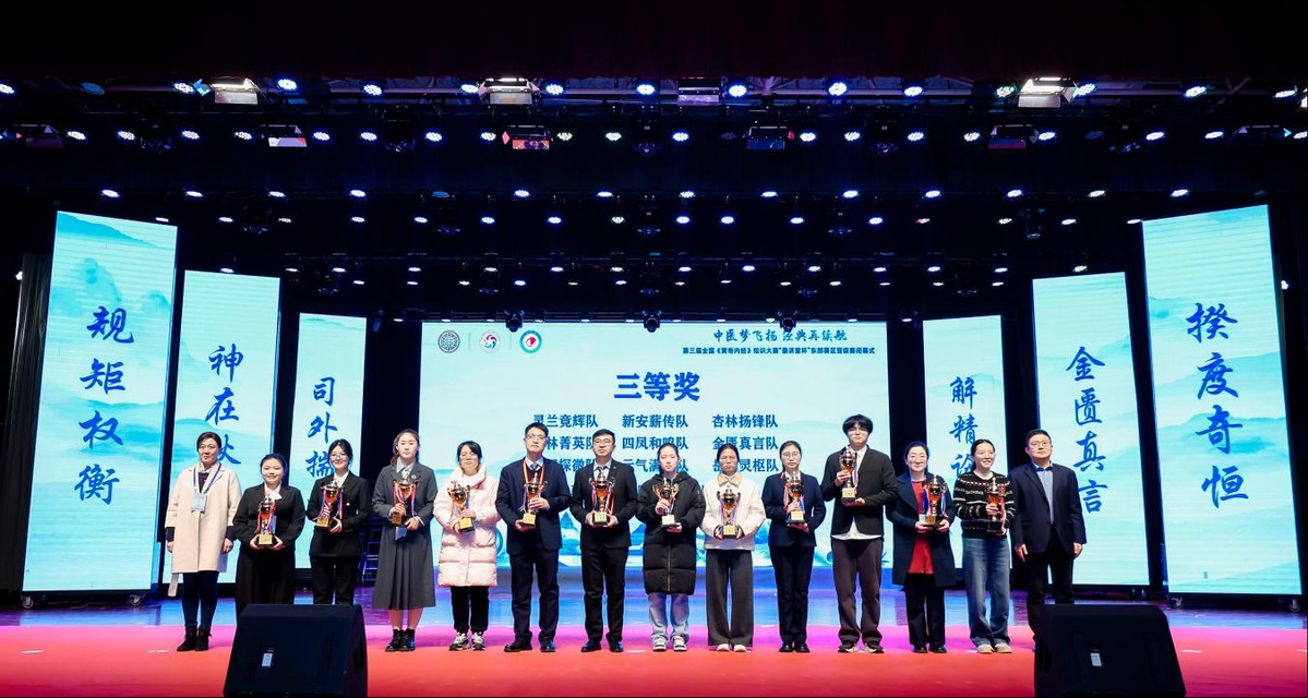 大赛以《内经选读》《内经讲义》等教材为核心,设预赛与决赛两大环节,全面考察选手的中医经典理论功底和临床运用能力。在预赛中,我校选手稳扎稳打,表现出色,顺利进入决赛。决赛环节各队不仅在必答题环节限时作答精准高效,更在抢答题、猜词题、综合论述题及风险题环节展开激烈比拼。最终我校灵枢启智队4名队员沉着应战、配合默契,在28支参赛队伍脱颖而出,以团体总分第3名的优异成绩夺得一等奖,闯入国赛。
