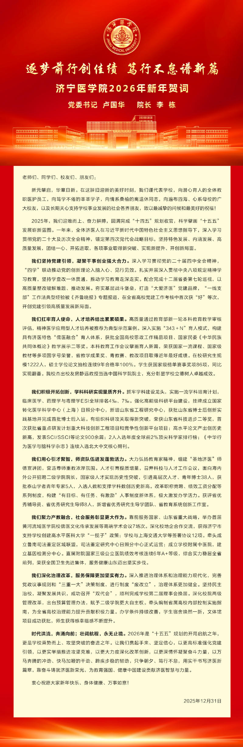逐梦前行创佳绩 笃行不怠谱新篇——济宁医学院2026年新年贺词