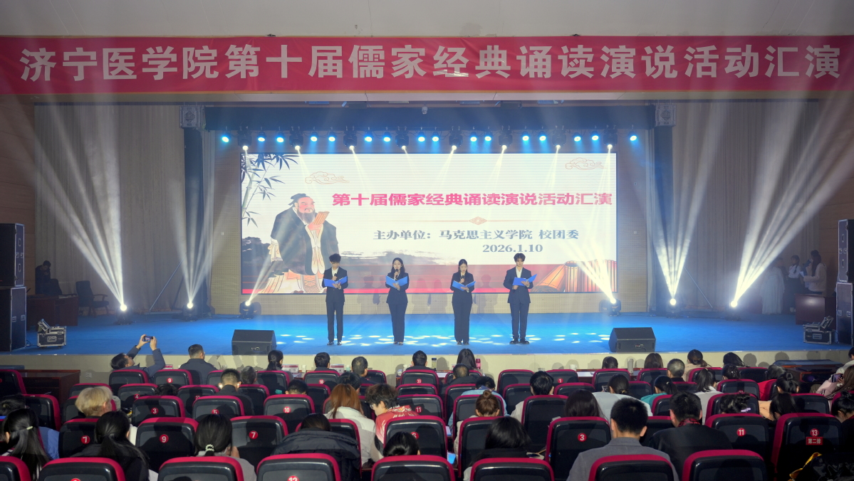 1月10日,由马克思主义学院、团委联合主办的济宁医学院第十届“儒家经典诵读演说活动”在我校太白湖校区举行。