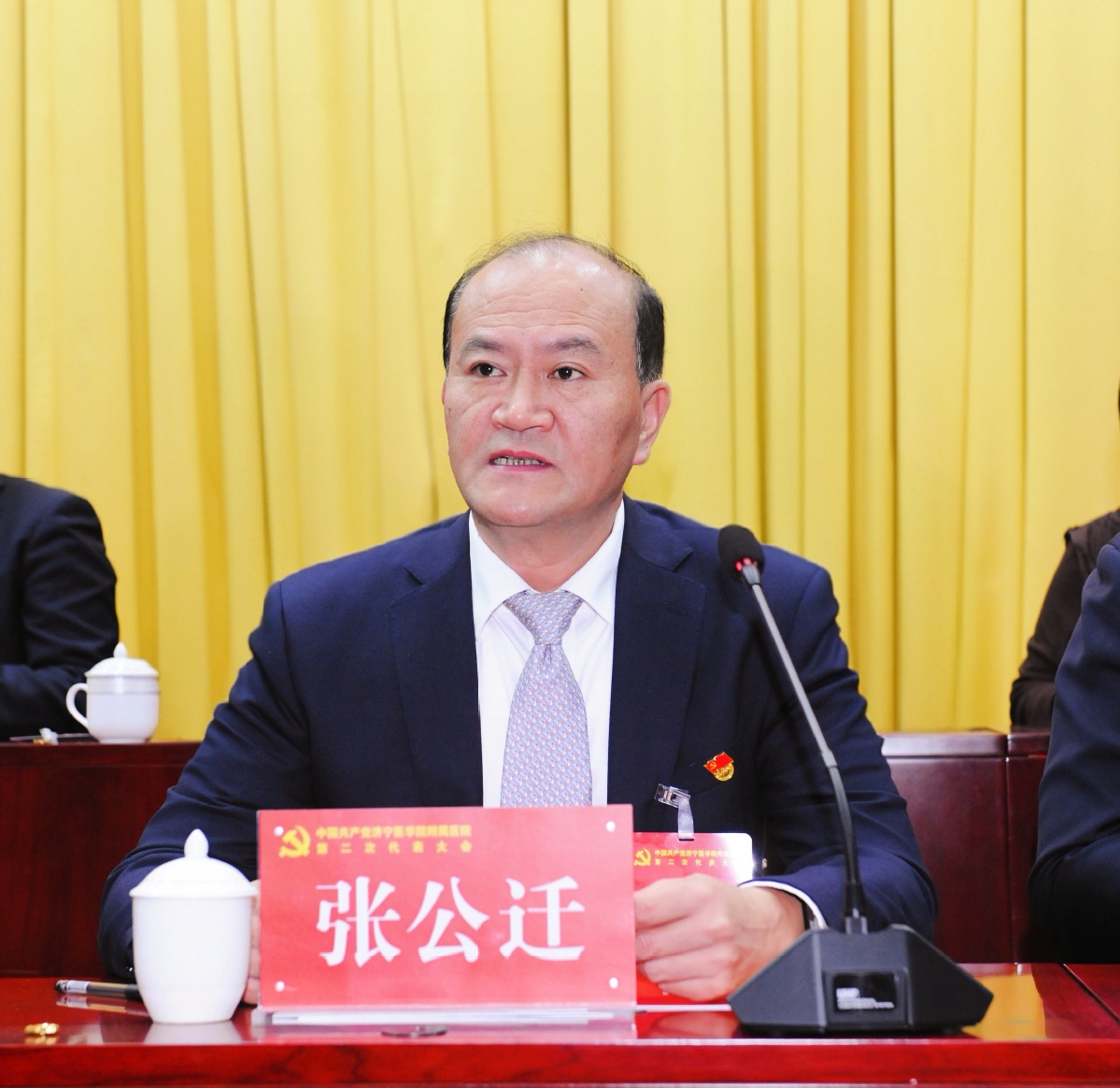 张公迁代表济宁市卫生健康委向大会的胜利召开表示热烈祝贺,对第一次党代会以来医院各项事业取得的成绩给予充分肯定。他表示,济医附院是济宁卫生健康行业的重要名片,也是济宁建设健康强市的关键力量,医院积极服务济宁大局,为加快提升全市卫生健康整体水平守护人民群众健康做出了积极贡献。他强调,希望医院在未来的发展中继续围绕“以人民健康为中心”,主动融入国家和省、市卫生健康事业大局,深化推动优质医疗资源扩容;充分发挥高水平医院的辐射带动与支撑作用,培育医疗服务新质生产力,更好助力全市卫健事业高质量发展。