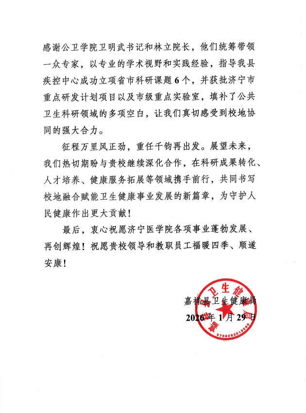 近日,嘉祥县卫生健康局向我校发来感谢信,对我校在党的建设、社会实践、医疗卫生、科学研究等方面助力地方公共卫生事业发展工作表示感谢。
