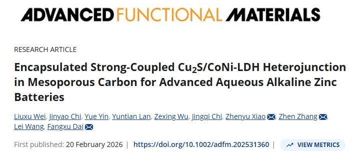 近日,药学院科研团队以第一通讯单位,在材料科学领域国际顶级期刊《Advanced Functional Materials》(AFM,中科院一区TOP,JCR一区,影响因子19)发表题为《Encapsulated Strong-Coupled Cu2S/CoNi-LDH Heterojunction in Mesoporous Carbon for Advanced Aqueous Alkaline Zinc Batteries》的研究论文。药学院戴方旭博士为第一通讯作者。