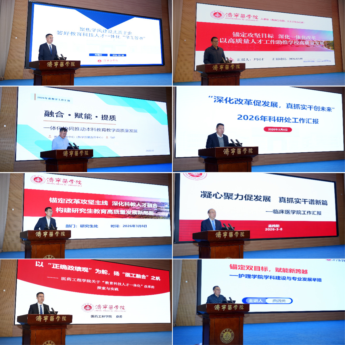 学生工作处、人事处、教务处、科研处、研究生处、临床医学院、医药工程学院、护理学院等8个部门、单位主要负责同志作了交流发言。